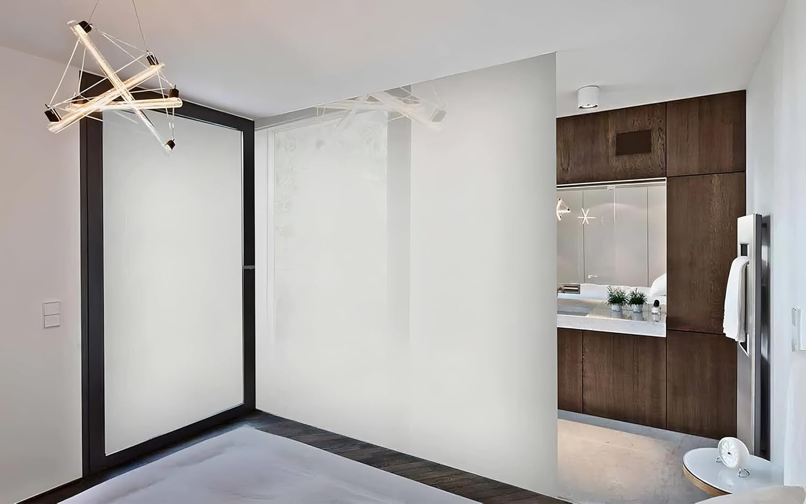 Smart film installations for homes, including bathrooms, bedrooms, and living spaces.