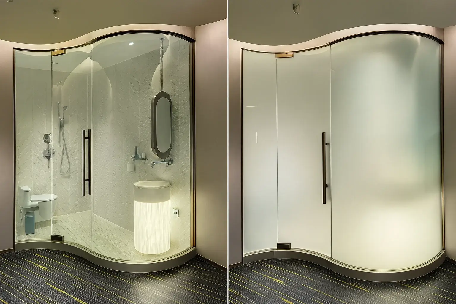 Instantly switchable privacy film that turns glass from clear to frosted opaque for on-demand privacy and security. Available in custom cut sizes with various controller options, engineered for Louisiana humidity.